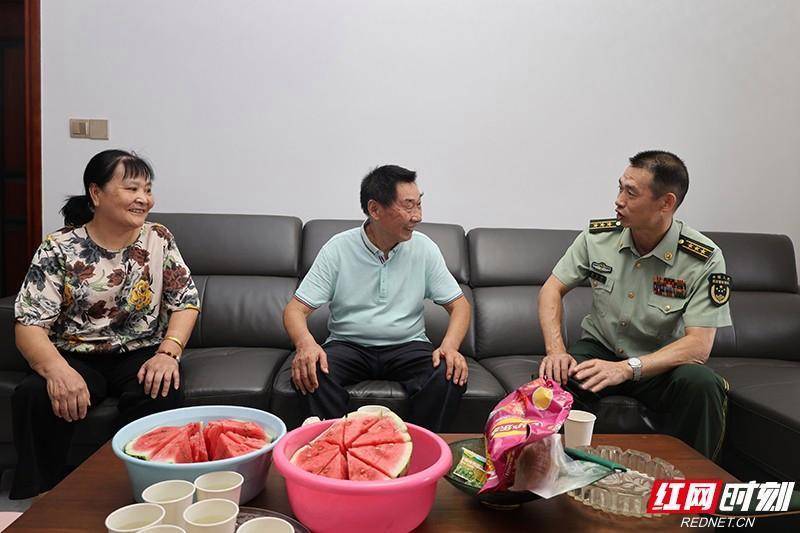 官兵与张超烈士的父母交流。红网时刻新闻8月1日讯(记者 陈宗昊 通讯员 尧星华 张刚)“八一”建军节前夕,武警岳阳支队官兵来到全军挂像英模张超烈士父母家中走访慰问,向他们致以节日问候和崇高敬意。“伯伯,最近天气炎热,您和阿姨身体都还好吗?”在张超烈士家中,支队领导吴志祥与张超父母促膝而坐、亲切交谈,详细了解他们的生活状况,解决实质性困难。自2016年张超烈士牺牲后,支队党委便接过烈士孝老敬老的义务,谈起这些,吴志祥表示:“烈士为国捐躯,党和人民永远不会忘记他们!我们有责任照顾好他们的家属,让家属感受到部队大家庭的温暖!”每到逢年过节,支队官兵积极踊跃看望两位老人,一起包粽子、吃月饼,并邀请张超父母与官兵共度春节……多年过去,支队官兵换了一茬茬,可照顾烈士家属的实际行动一天也没中断过。历史不会忘记,军人的牺牲奉献永远值得尊重和纪念,通过走访慰问、宣扬烈士英雄事迹,为支队全体官兵树立了崇尚英雄、缅怀先烈的良好风尚。举报/反馈